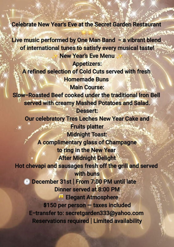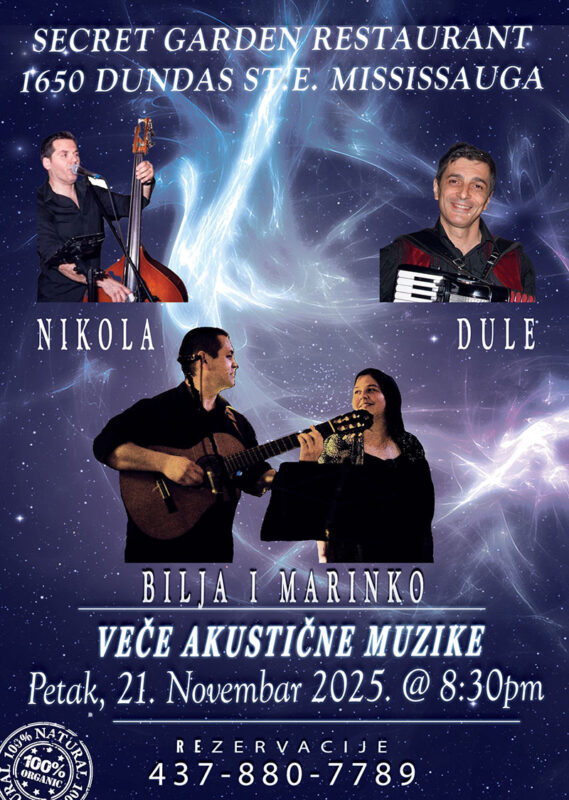Friday, November 21st, at Secret Garden Restaurant Great food, great music, great vibes! Join us for an unforgettable night with live performances of both local and international favorites. Dragi prijatelji Dule, Nikola, Bilja i Marinko sviraju za vas u restoranu Secret Garden u Mississaugi 21. novembra 2025. Za vase dobro raspolozenje potrudicemo se svirajuci domace […]